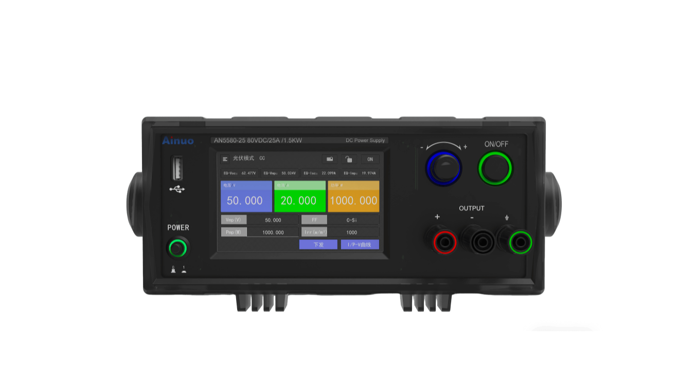 PV型号具有高电压电流瞬态响应,可实现V曲线快速变化,用于模拟各种太阳能电池板在不同环境(温度、光照、阴影)下的儿输出特性。该型号具备低纹波噪声和高速MPPT跟踪速度,当MPPT追踪频率上升后,输出能够精确地符合预设的I-V曲线。标配太阳能矩阵仿真软件,可实现EN50530、Sandia、NB/T32004、CGC/GF004、CGC/GF035光伏标准太阳能微逆变器-V曲线,有针对性覆盖太阳能微逆变器、功率优化器等测试行业应用.